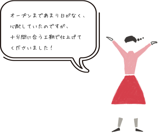 スピード感を意識した対応・施工を徹底。最短即日のご対応も可能ですので、「早めにオープンしたい」「すぐに対応してほしい」などのご要望もお気軽にご相談ください。