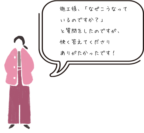 施工を担当したからこそ、お客様のこだわりが分かります。追加のご要望など、完工後もお客様に寄り添った対応を徹底しております。