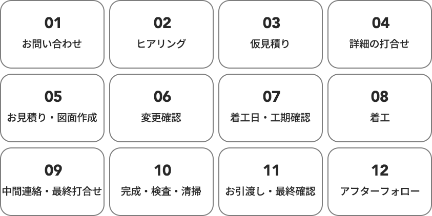 このように、細かくステップを踏んで工程を進めるのは、お客様のご要望をしっかりと汲み取り、それを仕上げるためです。 施工後の確認等も丁寧に行っておりますので、安心してお任せください。